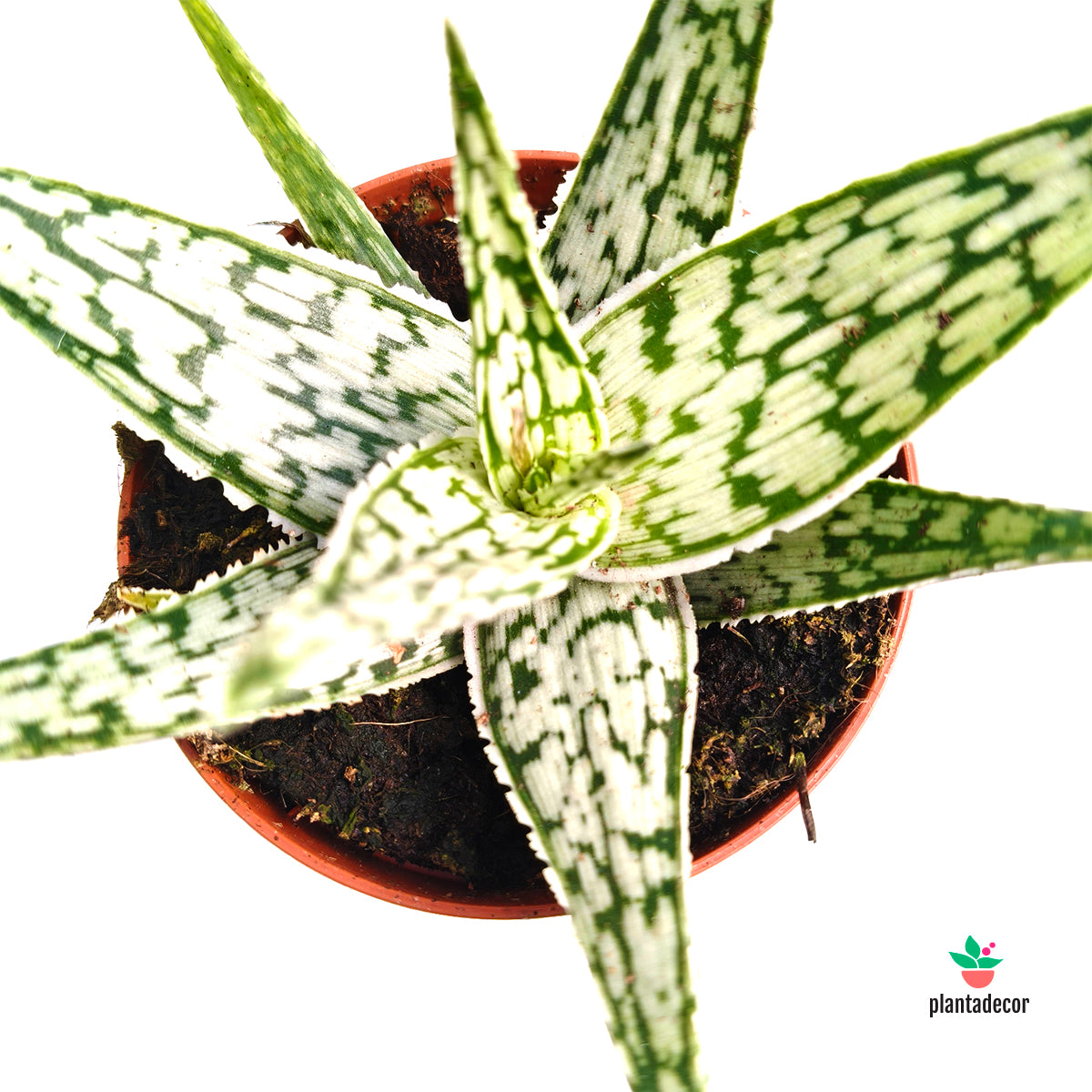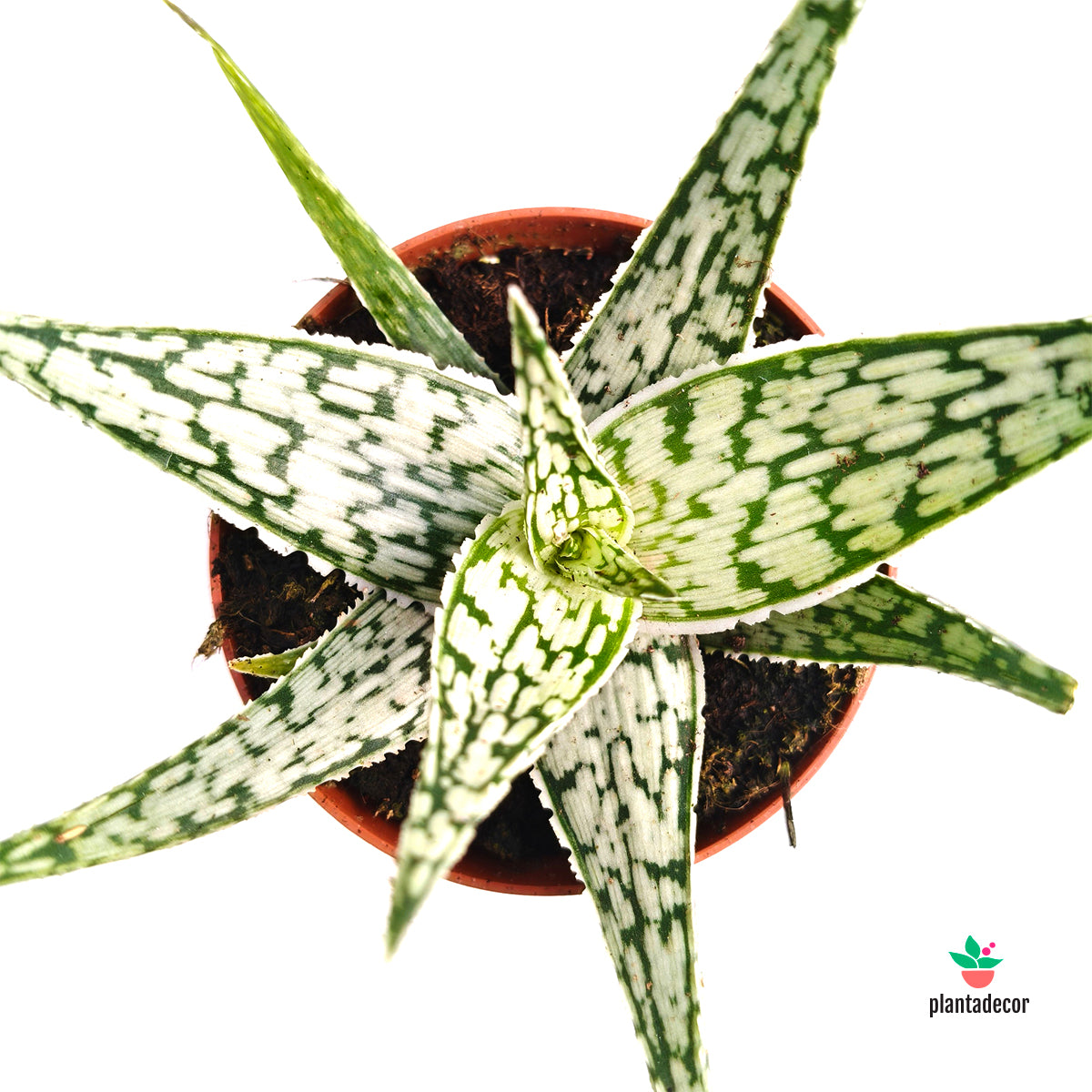 El Aloe rauhii ‘Snow Flake’ es una suculenta compacta y muy decorativa, conocida por sus hojas triangulares de color verde oscuro cubiertas de pequeñas motas blancas, que crean un efecto similar a copos de nieve. Su roseta densa y su patrón moteado la convierten en una planta muy atractiva para colecciones de suculentas.