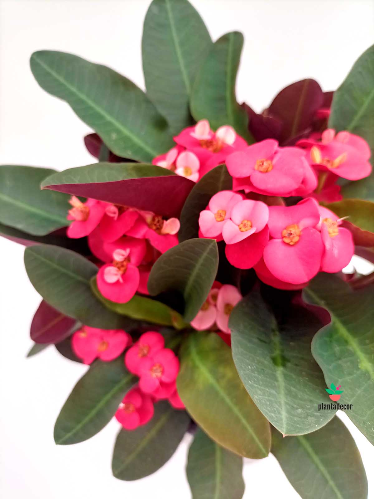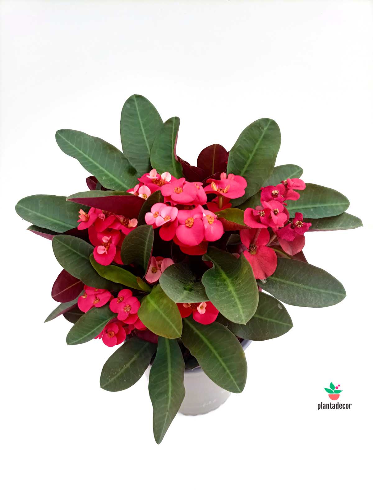 La Euphorbia milii ‘Red’, conocida como Corona de Cristo o Corona de espinas, es una planta suculenta perenne muy apreciada por su resistencia y su capacidad de florecer casi todo el año. Destaca por sus pequeñas y vibrantes flores rojas que contrastan con su follaje verde brillante y sus tallos espinosos, creando un efecto exótico y ornamental.