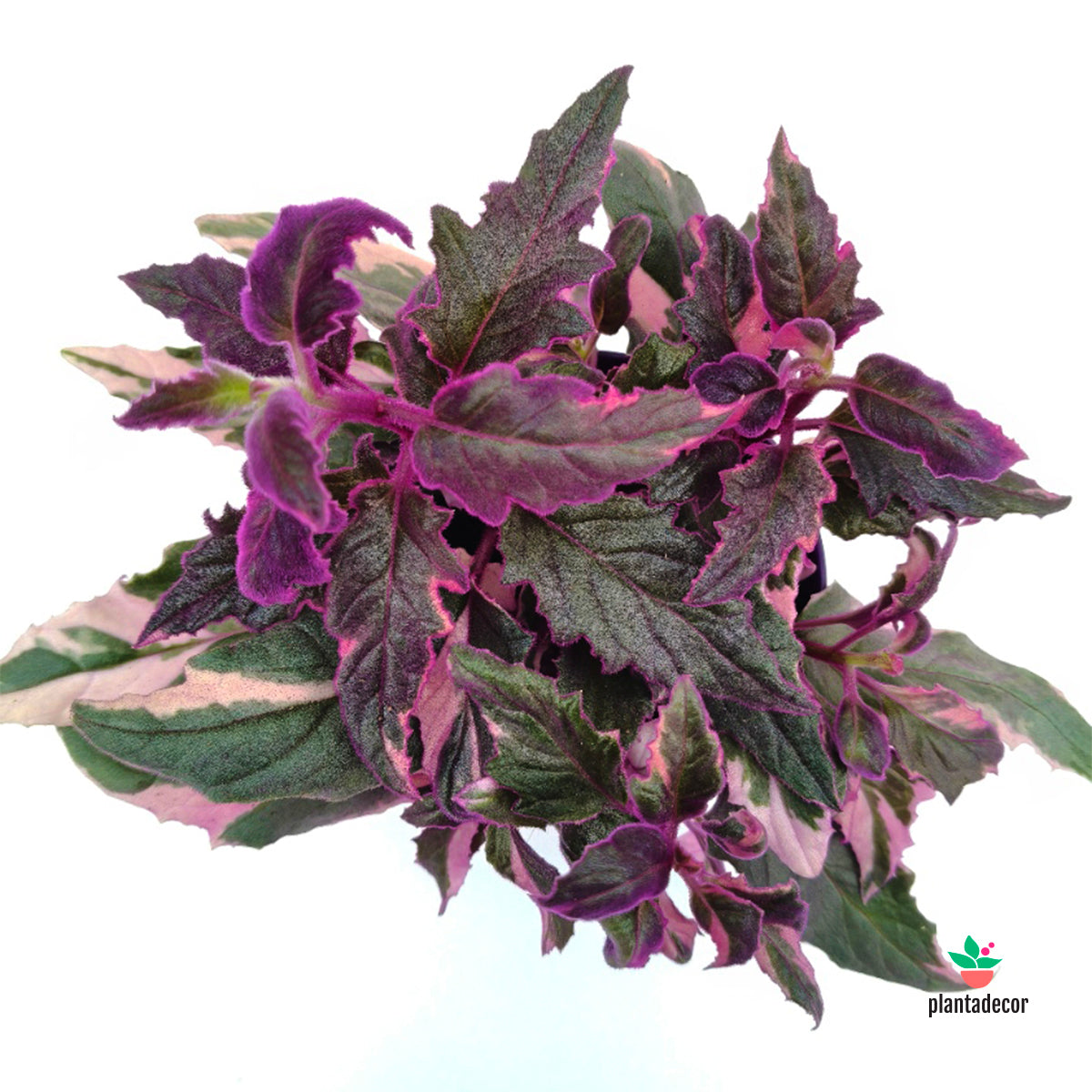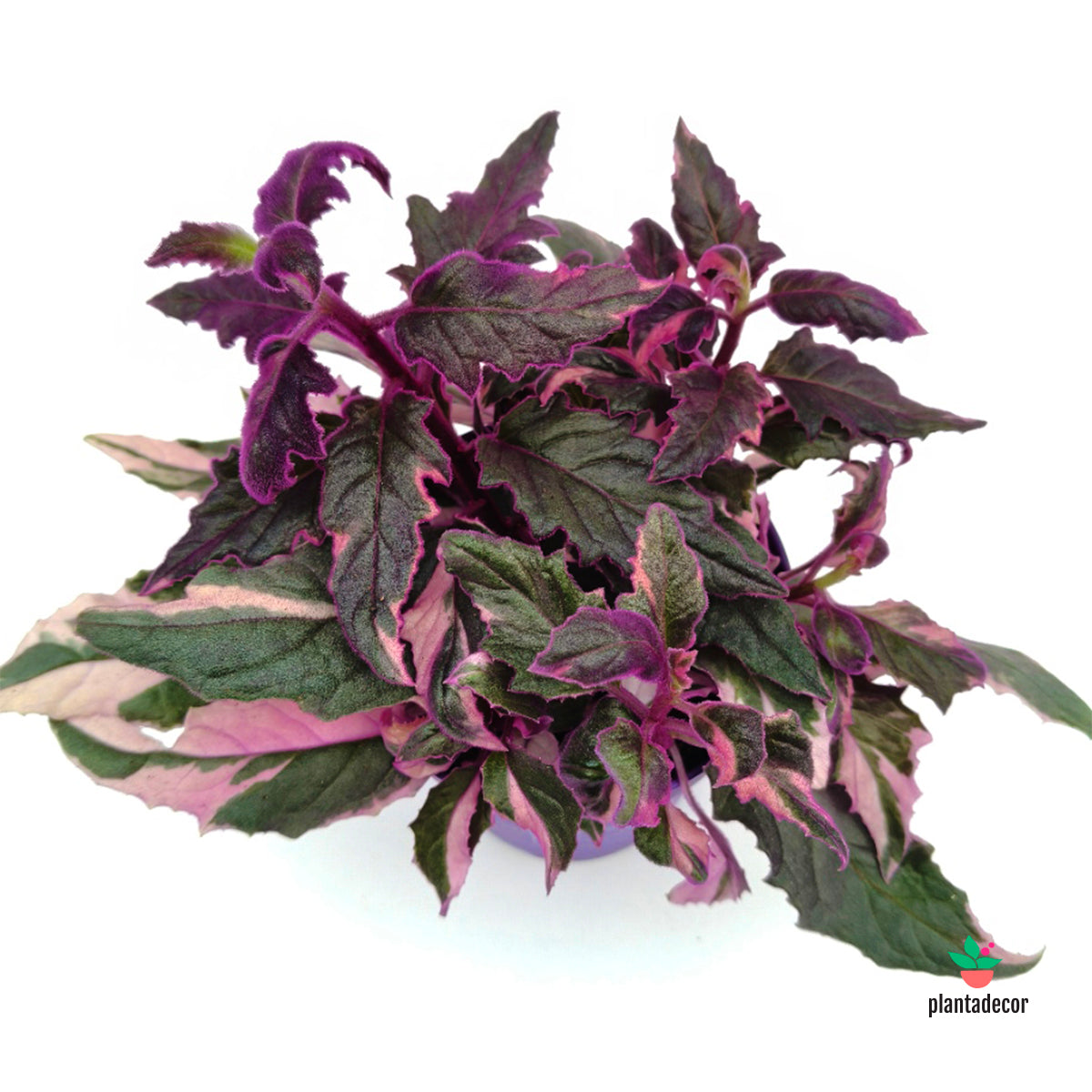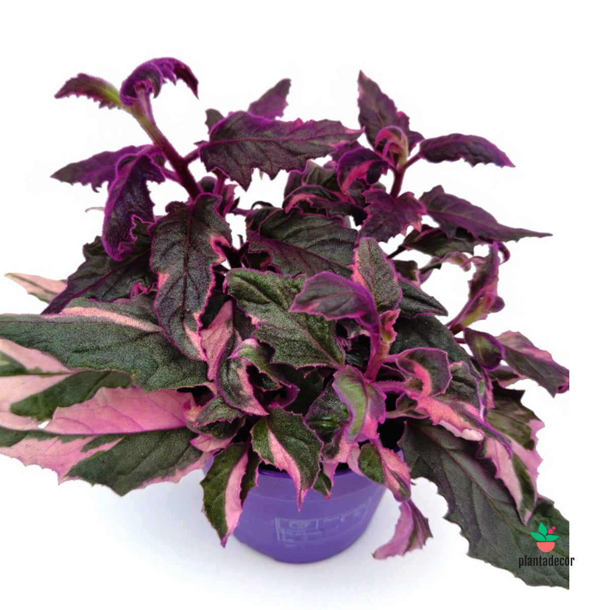 La Gynura aurantiaca pink variegata, conocida como planta terciopelo púrpura, es una especie tropical muy llamativa por sus hojas recubiertas de finos pelillos morados que le dan un aspecto aterciopelado y brillante. En esta forma variegada, combina zonas verdes y púrpuras, lo que crea un contraste único y decorativo.