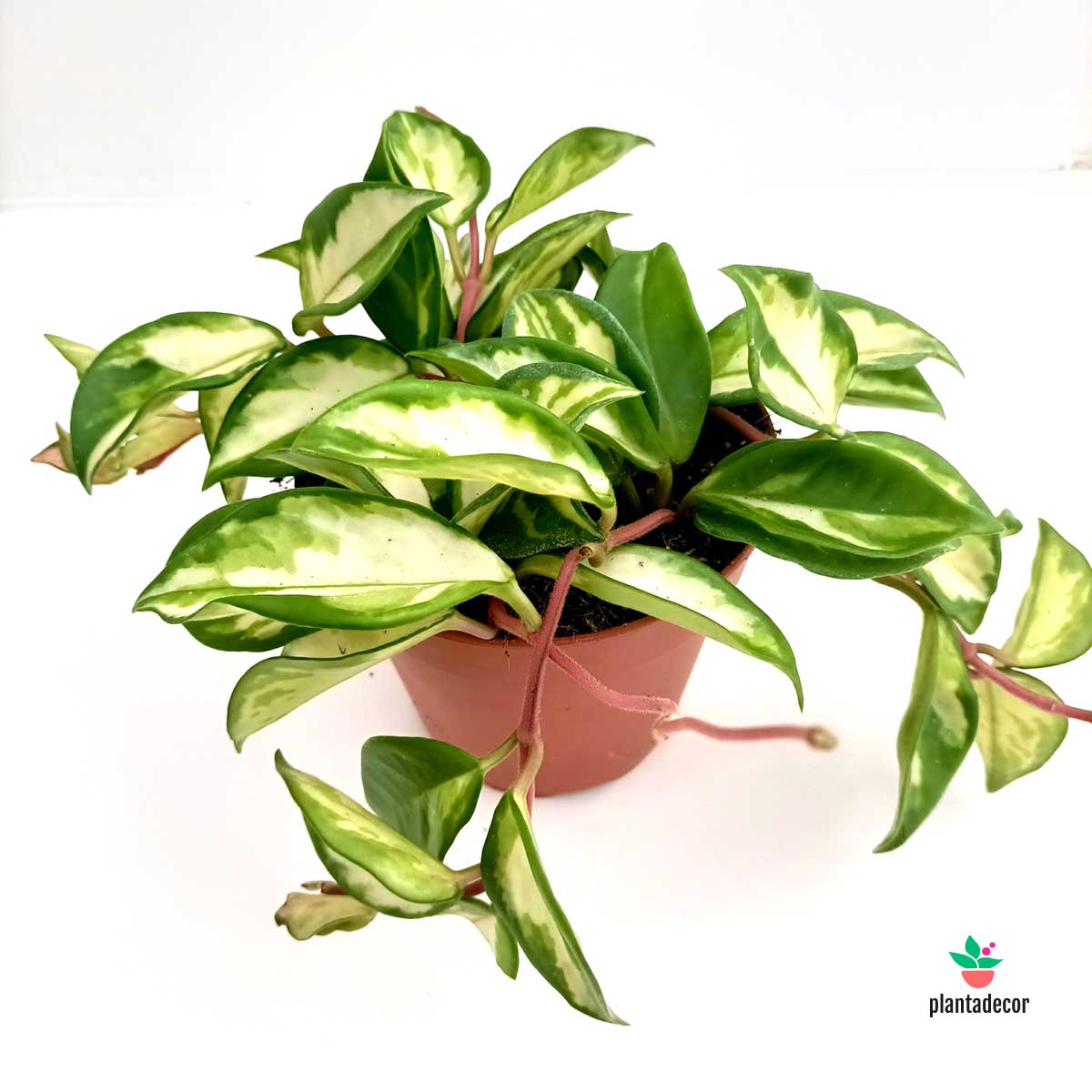 De crecimiento trepador o colgante, es perfecta para cestas colgantes, estanterías o tutores, donde sus tallos pueden formar una espectacular cascada de color. En condiciones adecuadas, florece con umbelas de flores cerosas en forma de estrella, de tonos blanco-rosados con centros rojizos, que además son fragantes.