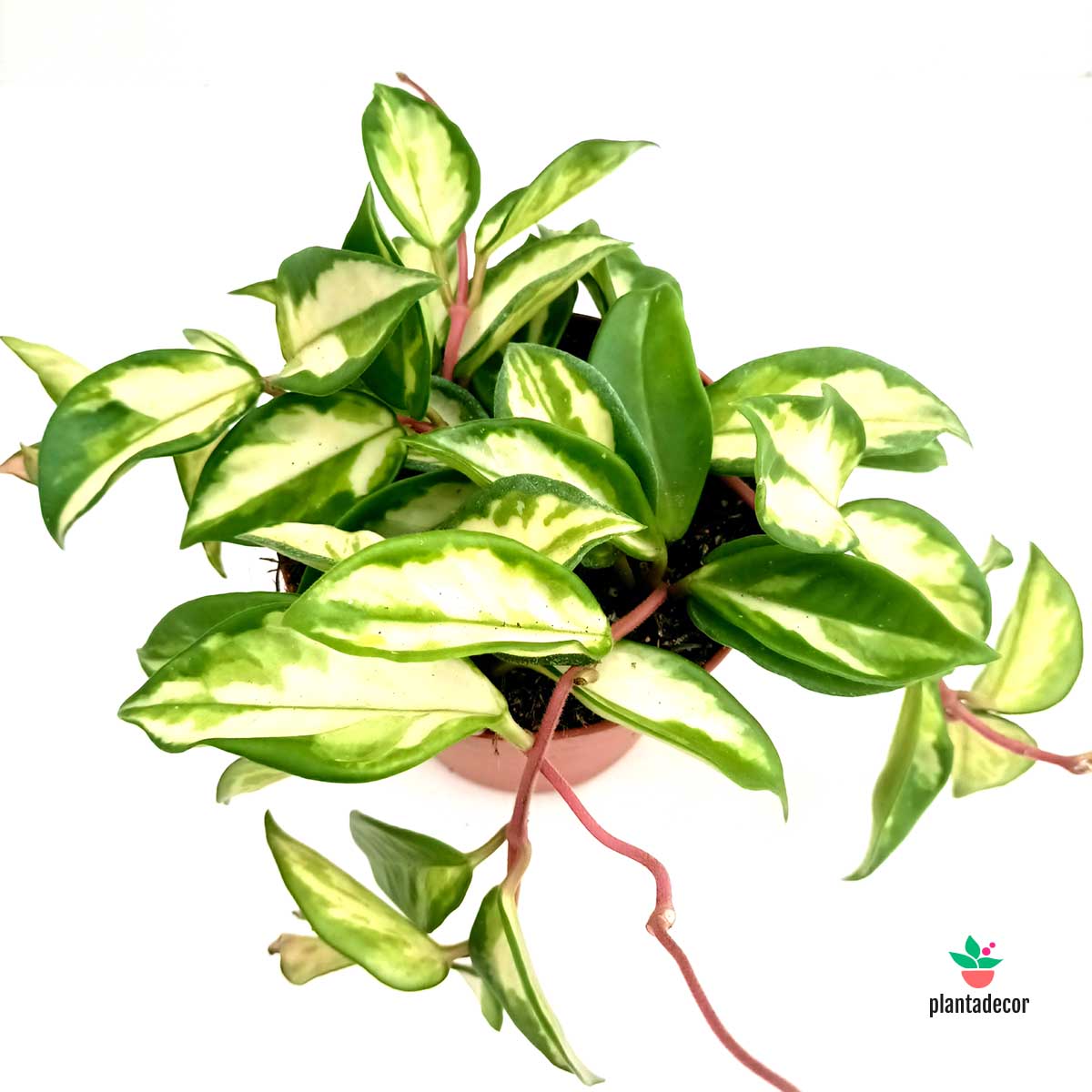 La Hoya carnosa ‘Tricolor’ es una de las variedades más apreciadas y vistosas dentro del género, gracias a sus hojas carnosas y brillantes que combinan tres tonalidades únicas: verde intenso, crema o blanco, y toques rosados en los brotes jóvenes. Esta mezcla cromática la convierte en una planta ornamental muy llamativa y elegante.