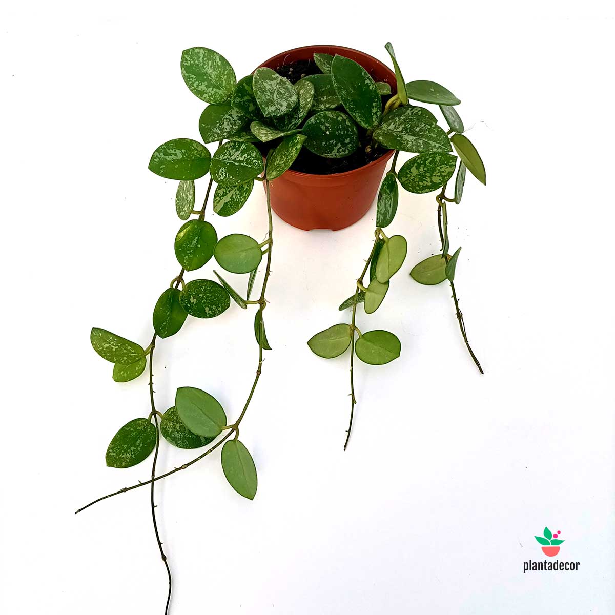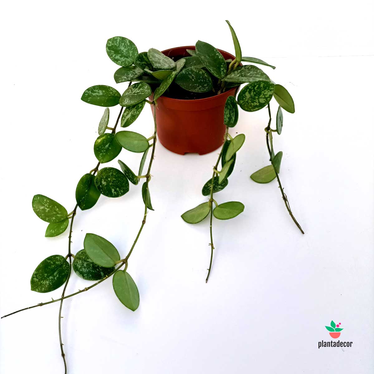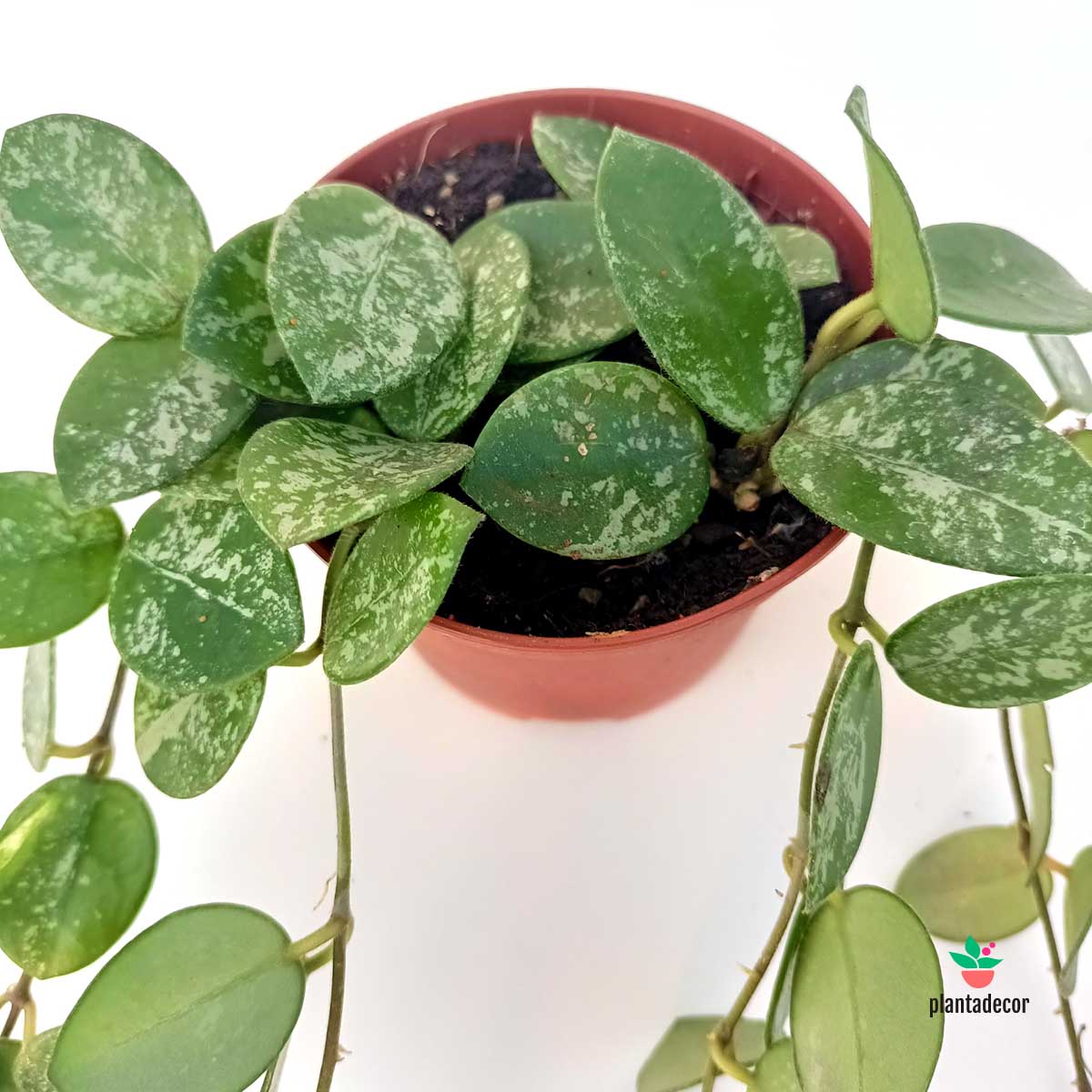La Hoya ‘Mathilde Splash’ es un híbrido muy apreciado, resultado del cruce entre Hoya carnosa y Hoya serpens. Destaca por sus hojas pequeñas, redondeadas y carnosas, de un verde intenso salpicado de manchas plateadas (splash) que brillan con la luz. Su porte compacto y colgante la convierte en una planta ideal para cestas, estanterías o colecciones de hoyas raras.