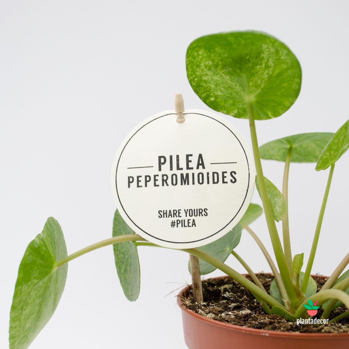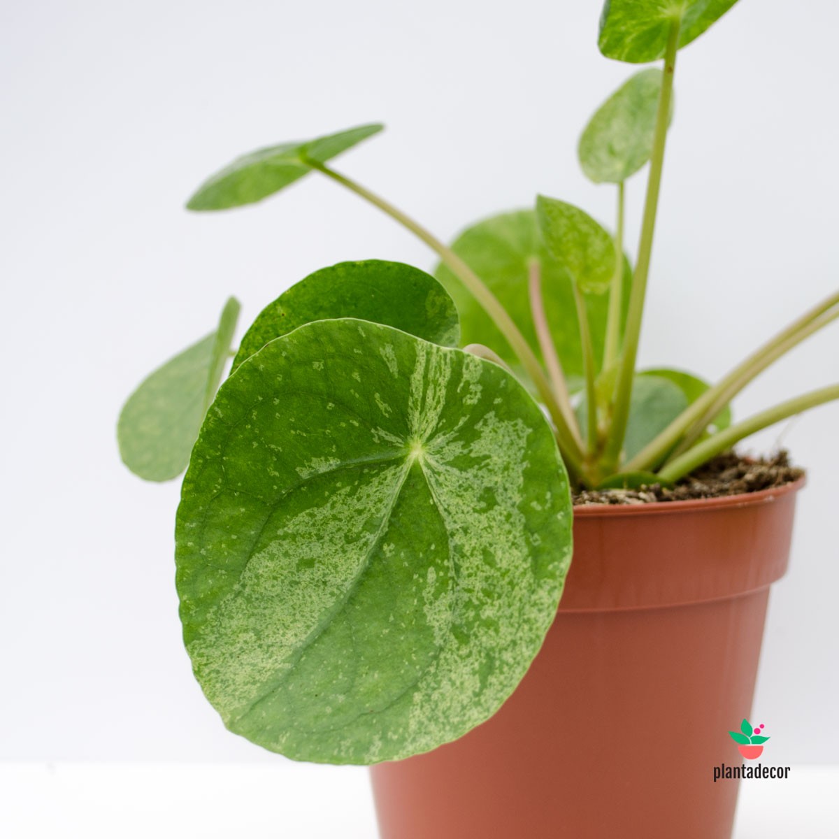 La Pilea peperomioides variegada ‘Mojito’ es una versión muy especial de la popular planta del dinero chino, reconocida por sus hojas redondeadas con variegación irregular en tonos verde claro, crema y blanco, que recuerdan a un fresco cóctel de menta. Cada hoja presenta un dibujo diferente, lo que hace que cada ejemplar sea único.