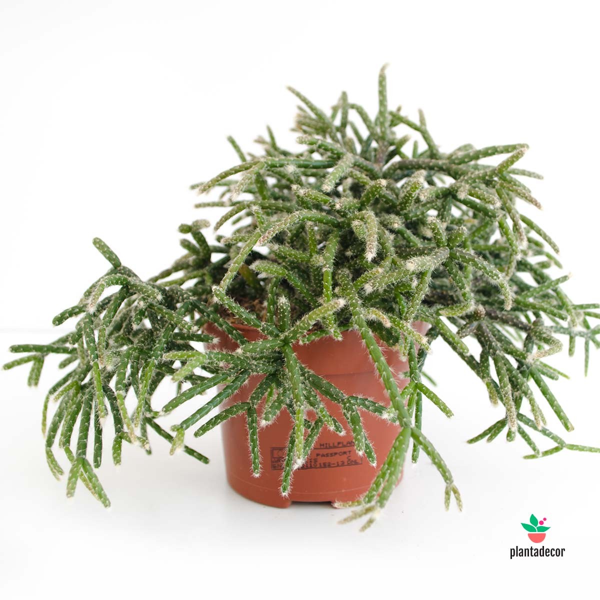 El Rhipsalis pilocarpa es un cactus epífito único, originario de bosques tropicales húmedos de Brasil. A diferencia de los cactus desérticos, presenta tallos cilíndricos finos cubiertos de pequeños pelitos que forman una caída suave y ligera, perfecta para macetas colgantes y estantes altos.