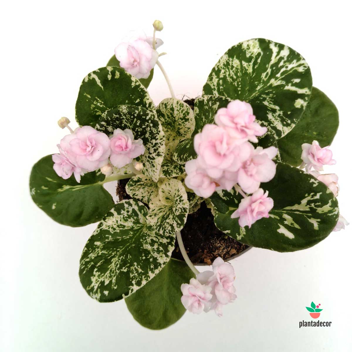 La Saintpaulia Variegated Double es una variedad muy especial de violeta africana, apreciada por sus flores dobles y abundantes y por su follaje variegado, donde se combinan tonos verdes con matices crema que aportan un aspecto delicado y muy luminoso. Su tamaño compacto y su floración generosa la convierten en una planta ideal para interiores cuidados y espacios acogedores.