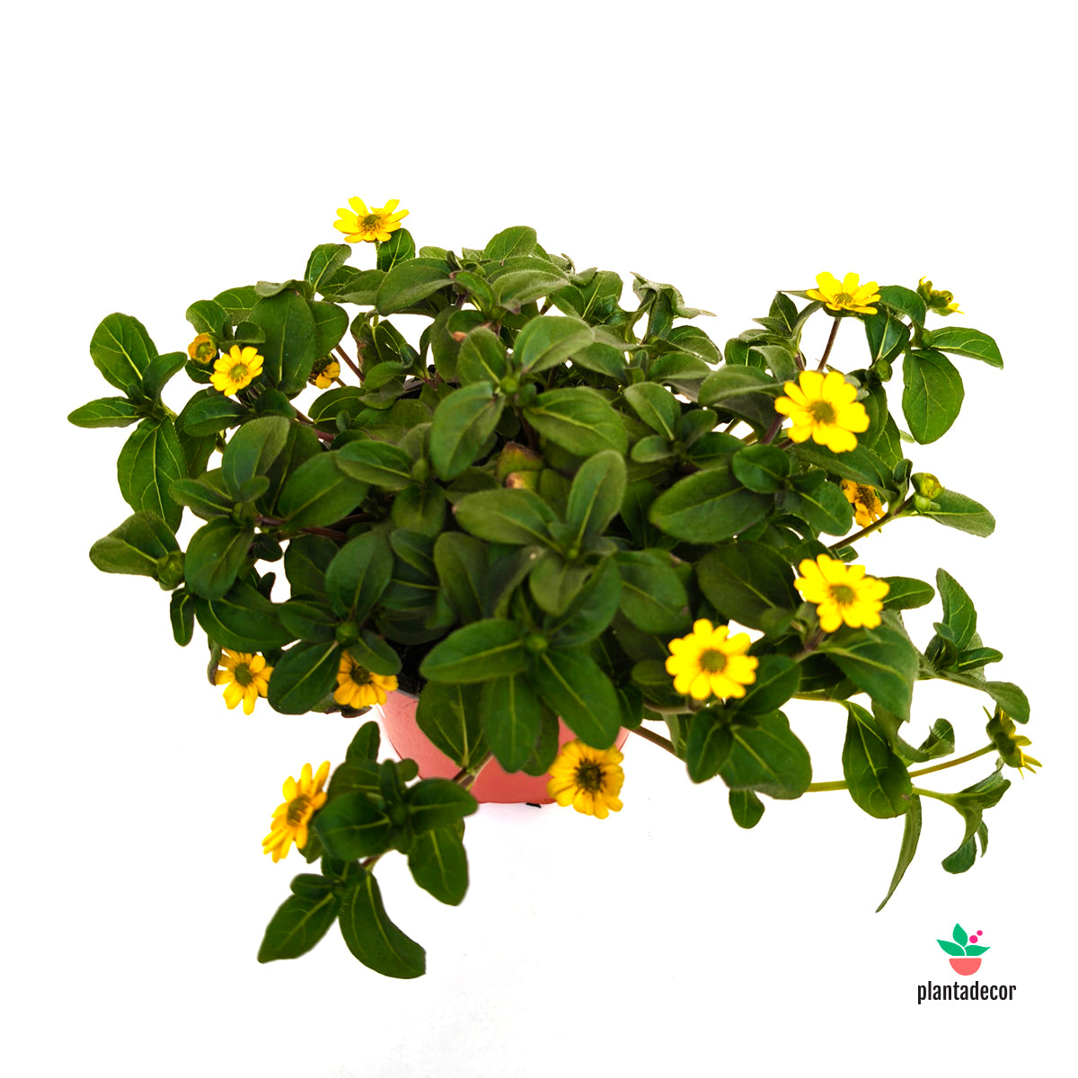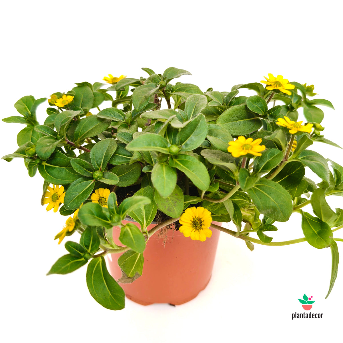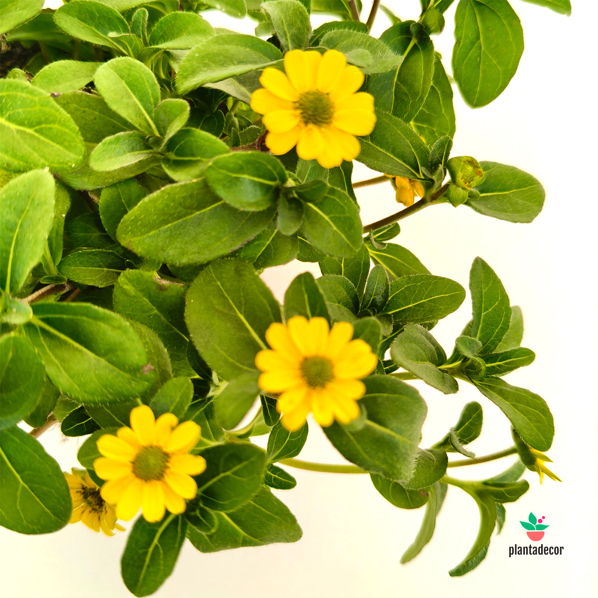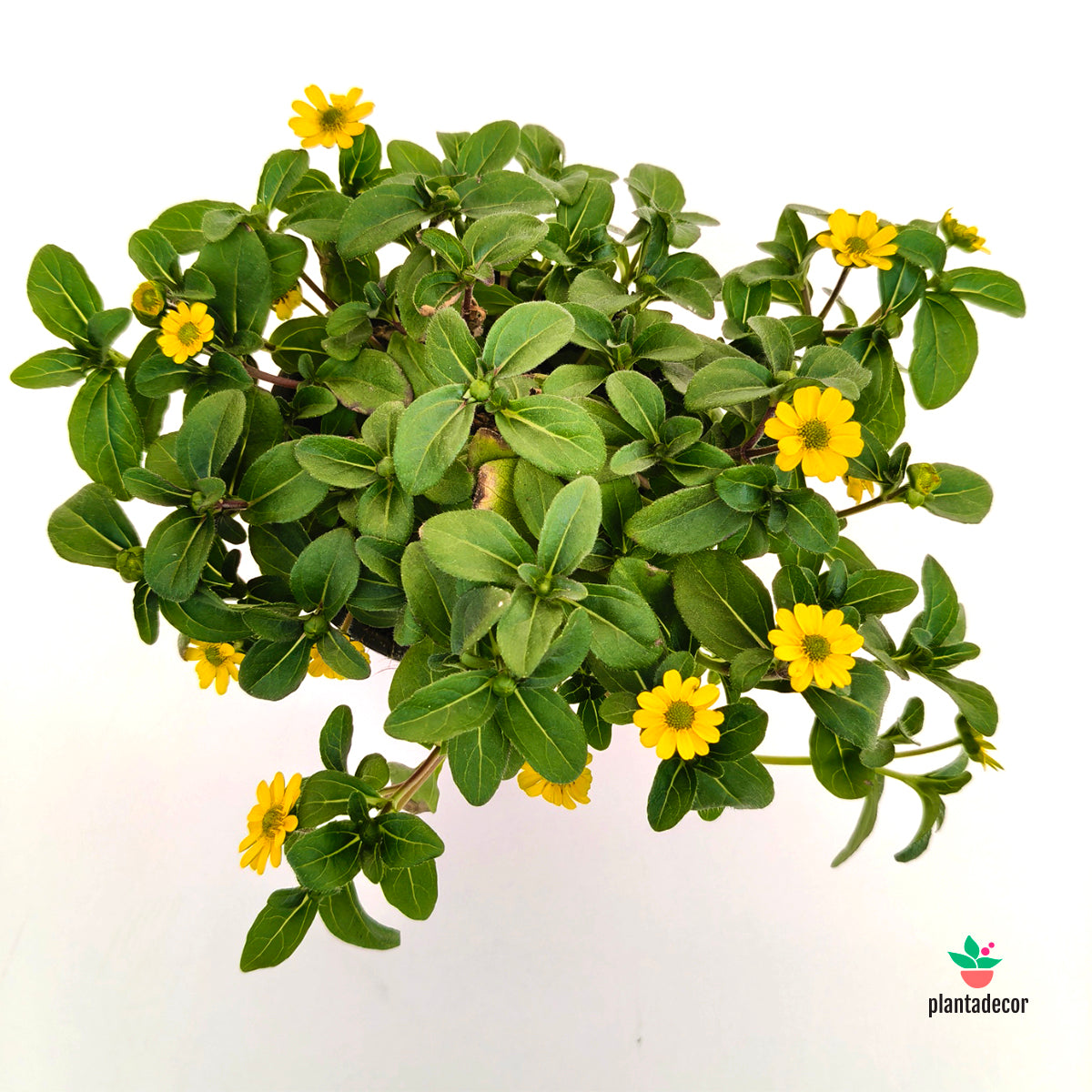 La Sanvitalia es una planta anual muy alegre y florífera, apreciada por sus pequeñas flores amarillas tipo margarita con centro oscuro, que cubren la planta durante largos periodos. Su aspecto compacto y su floración abundante la convierten en una opción perfecta para aportar color continuo.