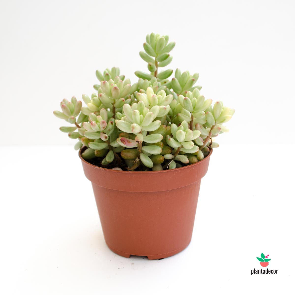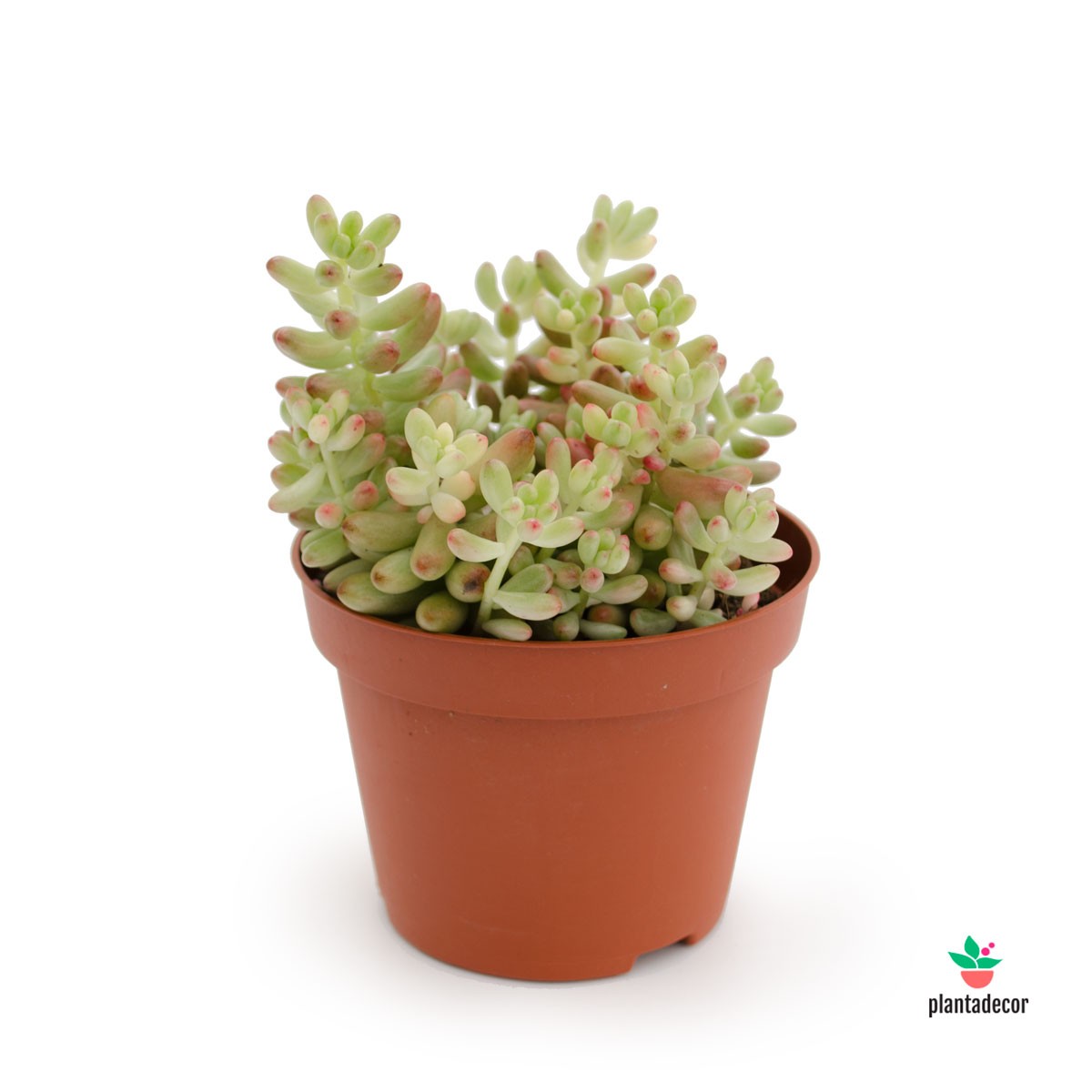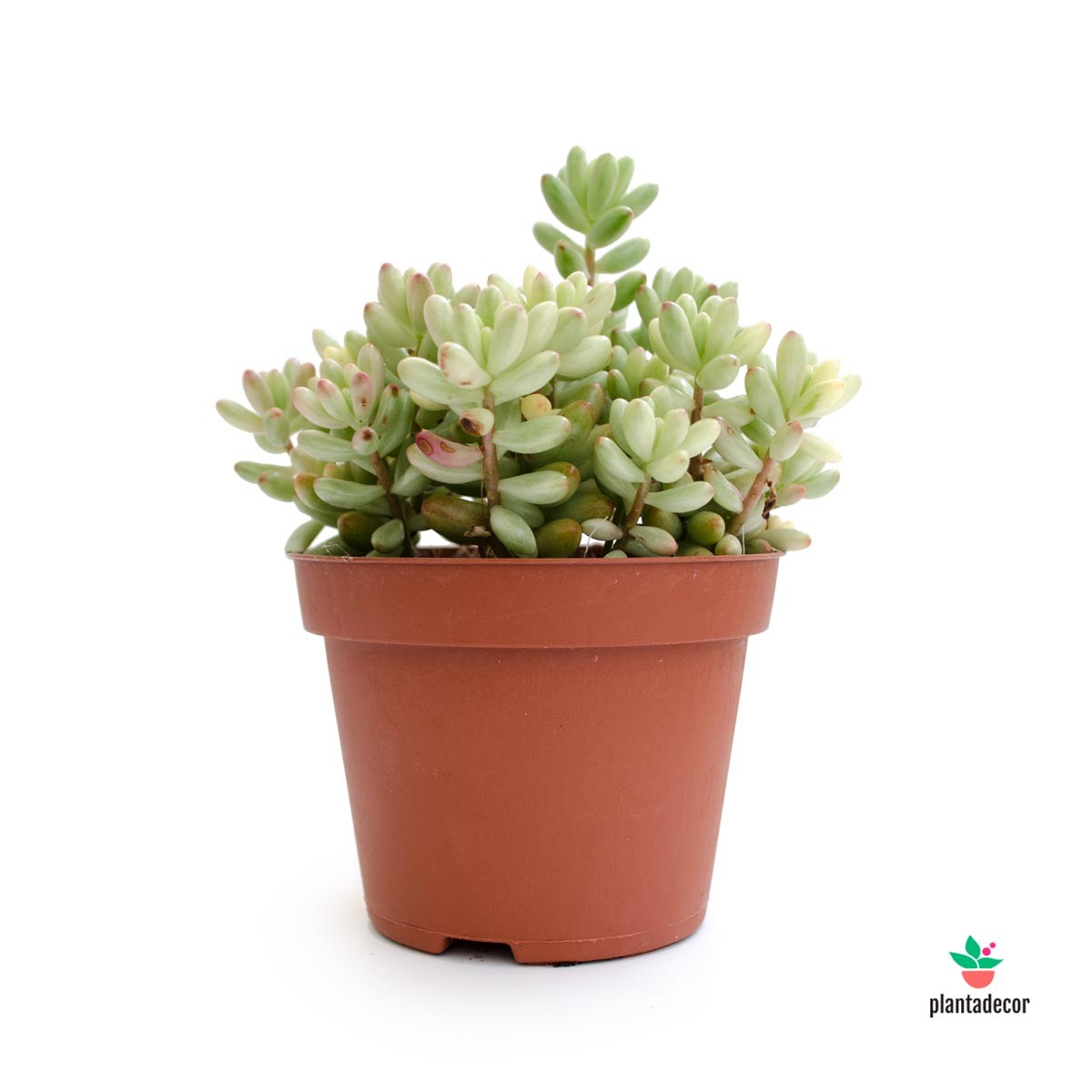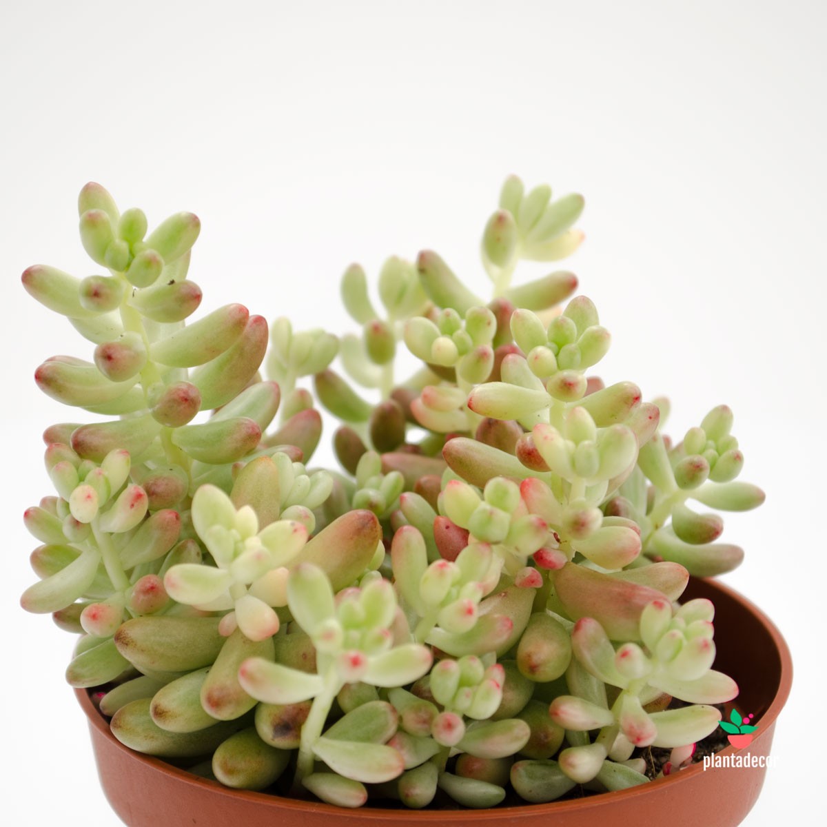 El Sedum rubrotinctum ‘Aurora’, también conocido como planta gominola rosada o jelly bean pink, es una suculenta encantadora y coleccionable, famosa por sus hojas carnosas en forma de pequeñas judías, que muestran una mezcla de tonos verdes, crema y rosados. Con la luz solar adecuada, sus hojas se tiñen de un rosa más intenso, creando un efecto dulce y vibrante.