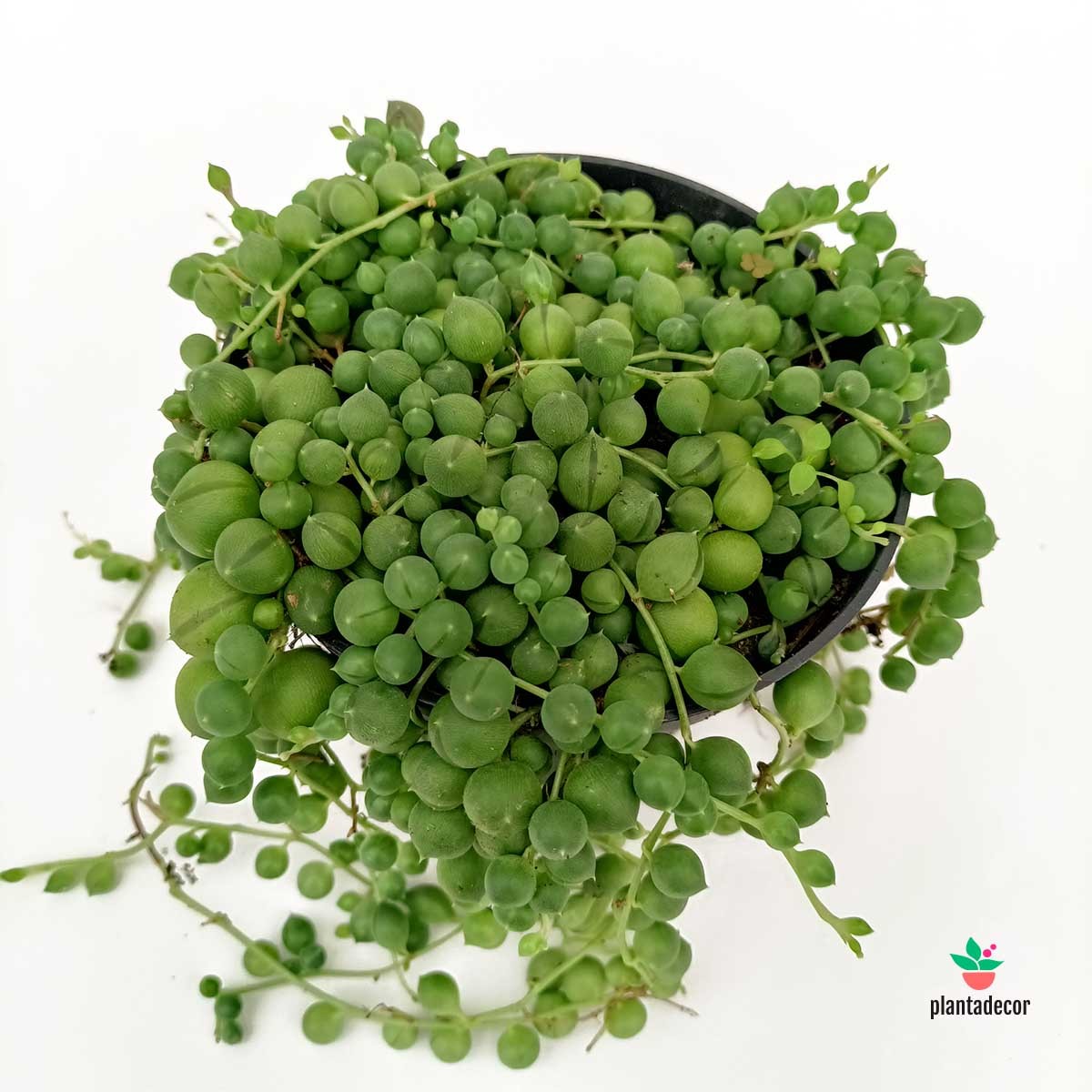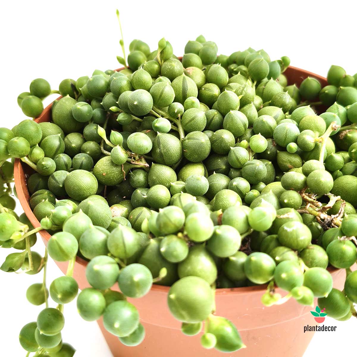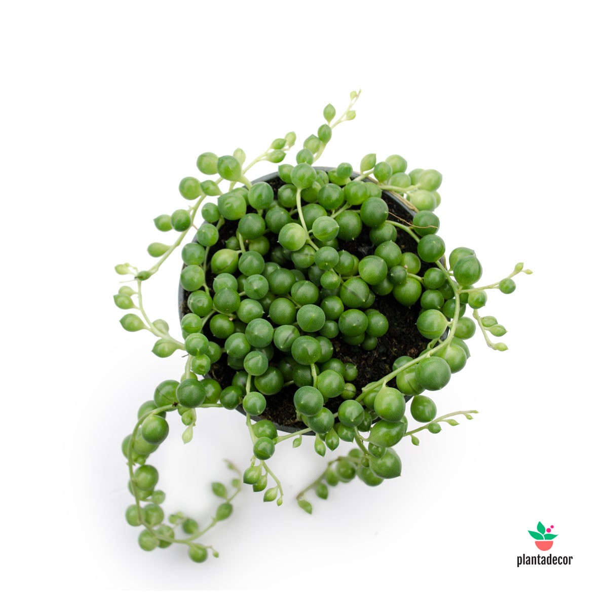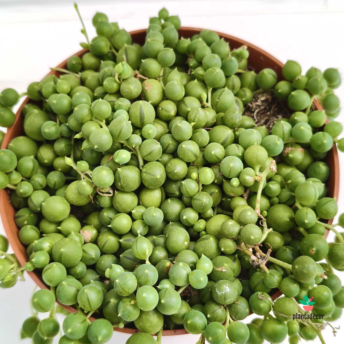 El Senecio rowleyanus, conocido como collar de perlas, es una de las suculentas colgantes más apreciadas y reconocibles gracias a sus hojas esféricas que parecen pequeñas cuentas verdes, dispuestas en largos tallos colgantes. Su aspecto original lo convierte en una planta perfecta para cestas colgantes, estanterías altas y composiciones decorativas.