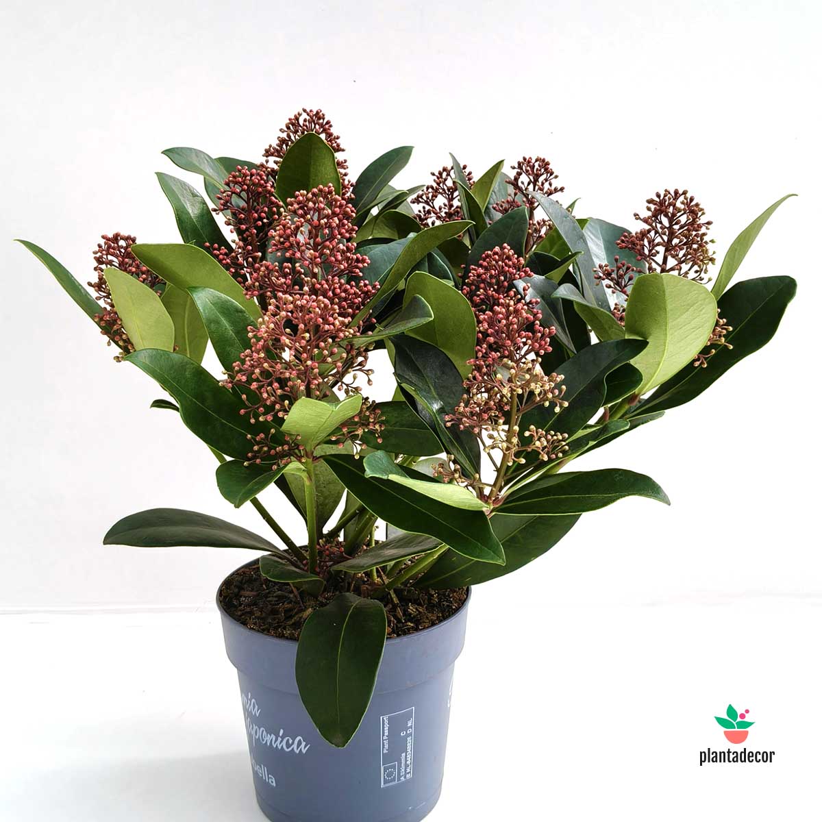 La Skimmia japonica ‘Rubella’ es una de las variedades más populares y espectaculares de Skimmia. Destaca por sus capullos rojos intensos en invierno, que se abren en primavera en racimos de flores blancas fragantes, atrayendo polinizadores y llenando el aire de perfume.