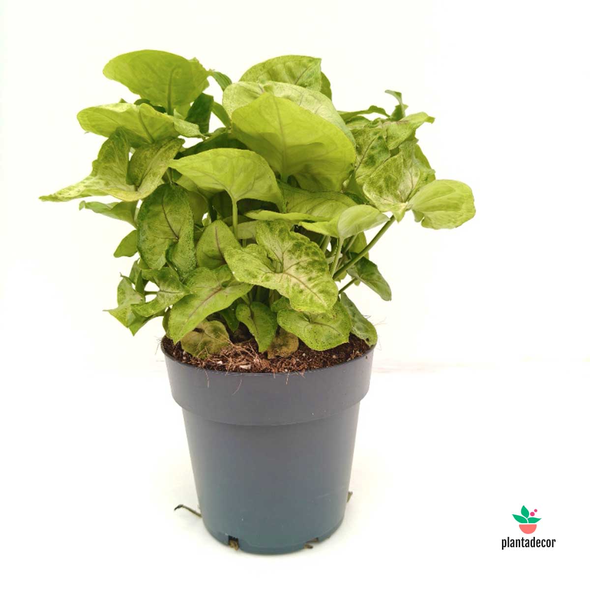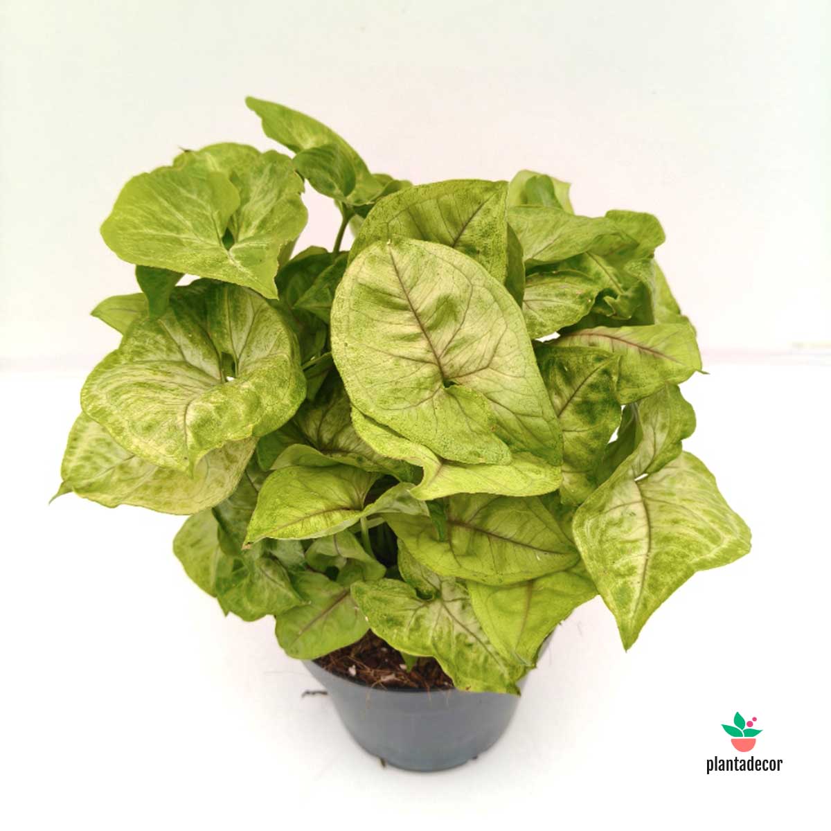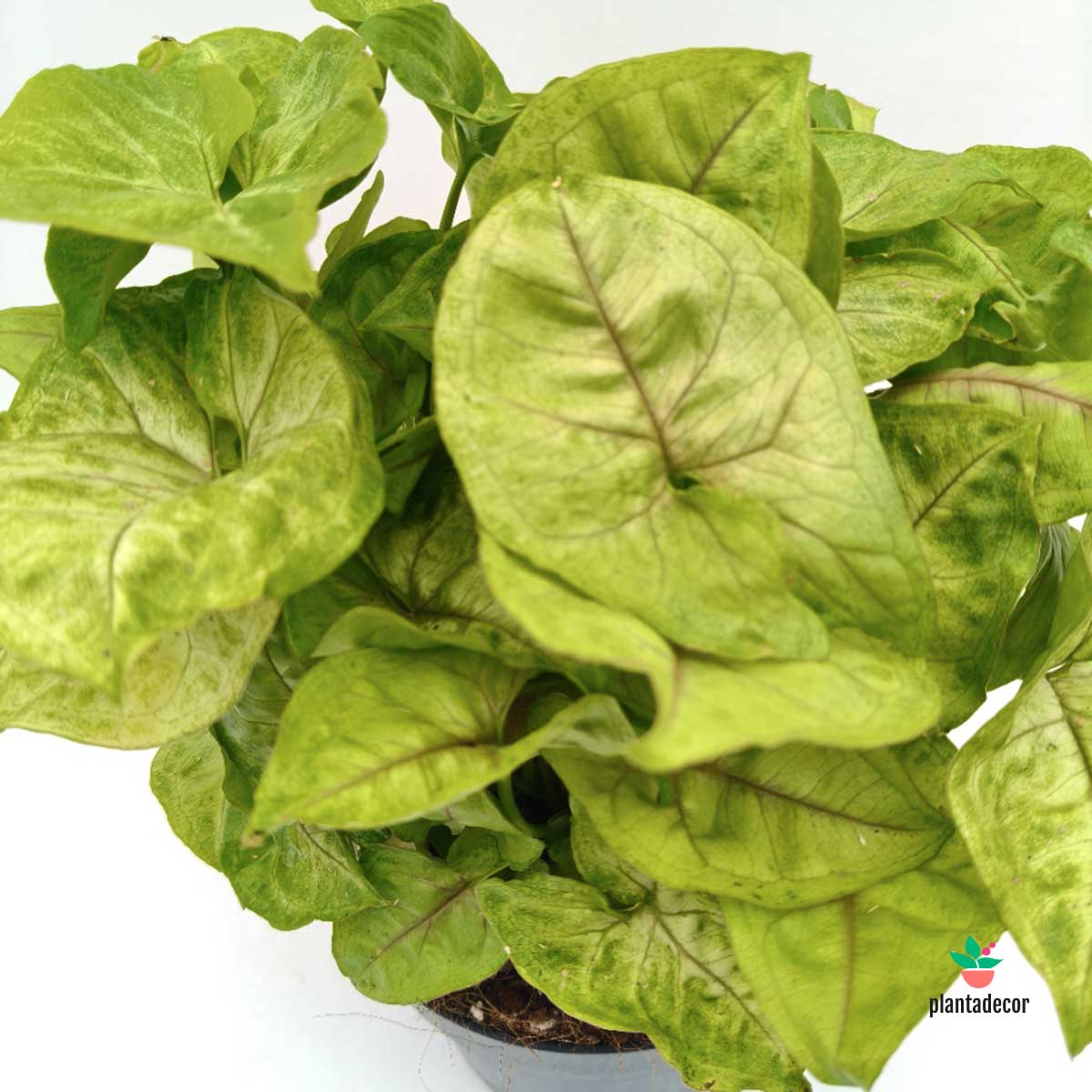 El Syngonium ‘Golden Allusion’ brilla con tonos verde lima dorado y nervaduras rosadas, creando un efecto luminoso y suave. Perfecto para interiores frescos, aporta una atmósfera alegre y serena.